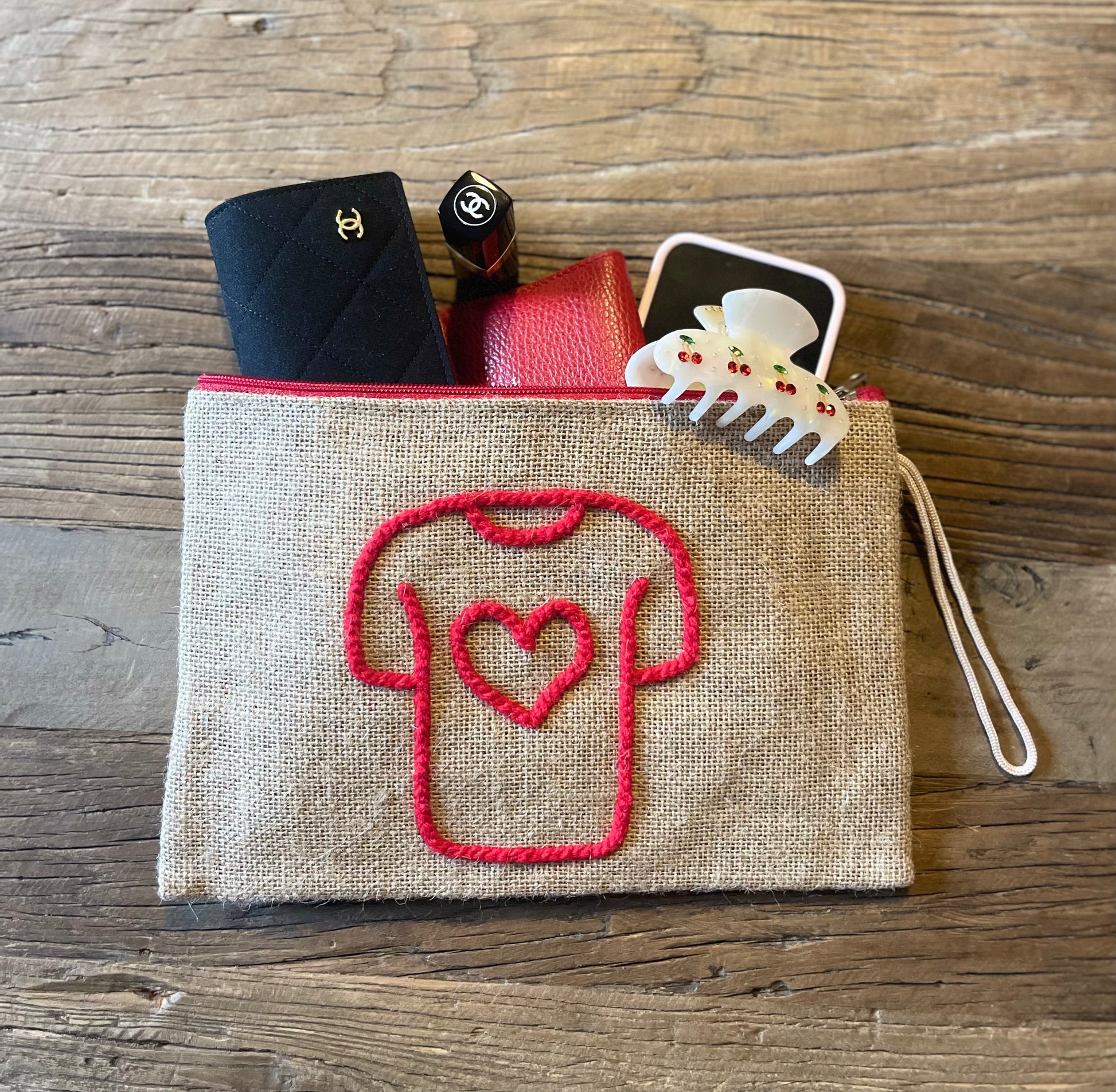 Ajoutez une touche artisanale et moderne à votre quotidien avec ces pochettes 100 % toile de jute, brodées à la main au Maroc.